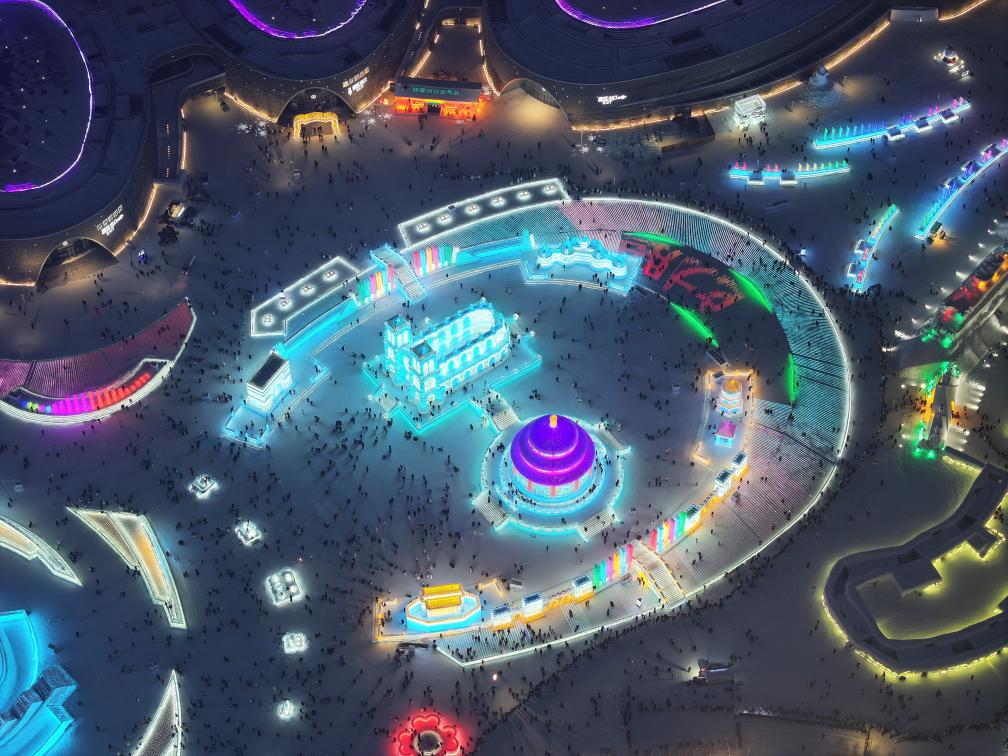 松花江北岸,夜幕降临。哈尔滨冰雪大世界园区里,灯光映射下,以北京天坛和巴黎圣母院为原型的巨型冰雕色彩斑斓、熠熠生辉。