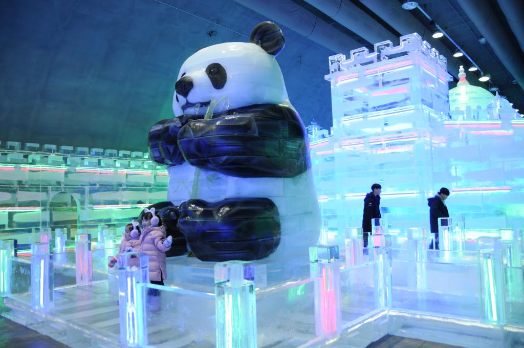 1月13日,在韩国江原道的华川山鳟鱼节现场,游客在哈尔滨工匠制作的大熊猫冰雕作品前留影。新华社发(杨畅摄)