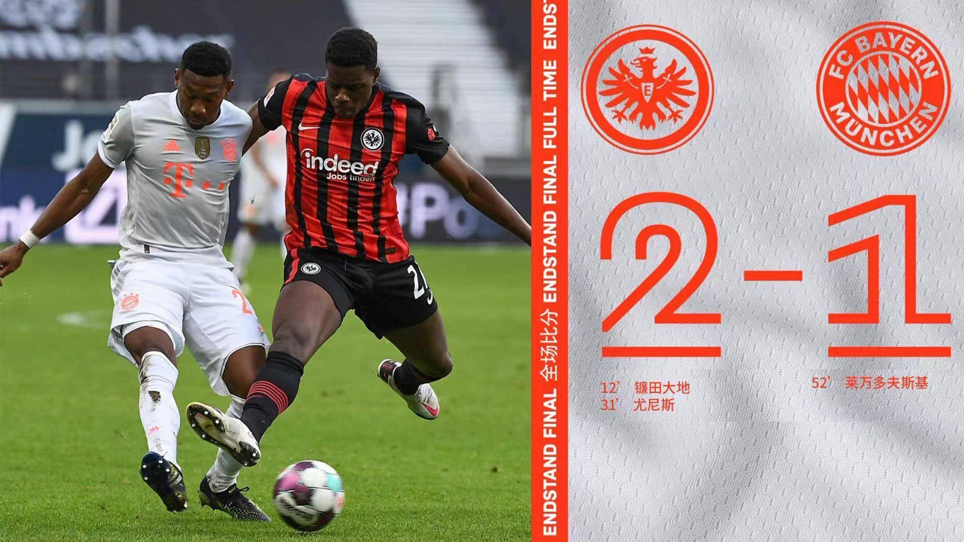 比赛第11分钟,科斯蒂奇送出助攻,日本中场镰田大地前点包抄破门,法兰克福取得领先;比赛第32分钟,镰田大地将球交给尤尼斯,后者在禁区内直接起脚轰出一脚绝对死角的世界波,拜仁在上半场便陷入2球落后的境地。