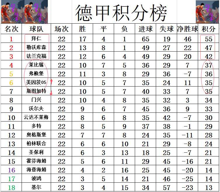 积分榜方面,拜仁昨天低调的守平勒沃库森后,继续8分优势领跑,据多家知名媒体预测,现在拜仁夺冠的几率已经高达93%以上。法兰克福止住颓势后,将和勒沃库森的差别缩小到5分,同时领先第4名的莱比锡5分,第3的位置还是很稳的。美因茨今天赢球后升至第6,第4名的争夺就很激烈了,从第4的莱比锡到第7的斯图加特,4队的分差就在2分之间。