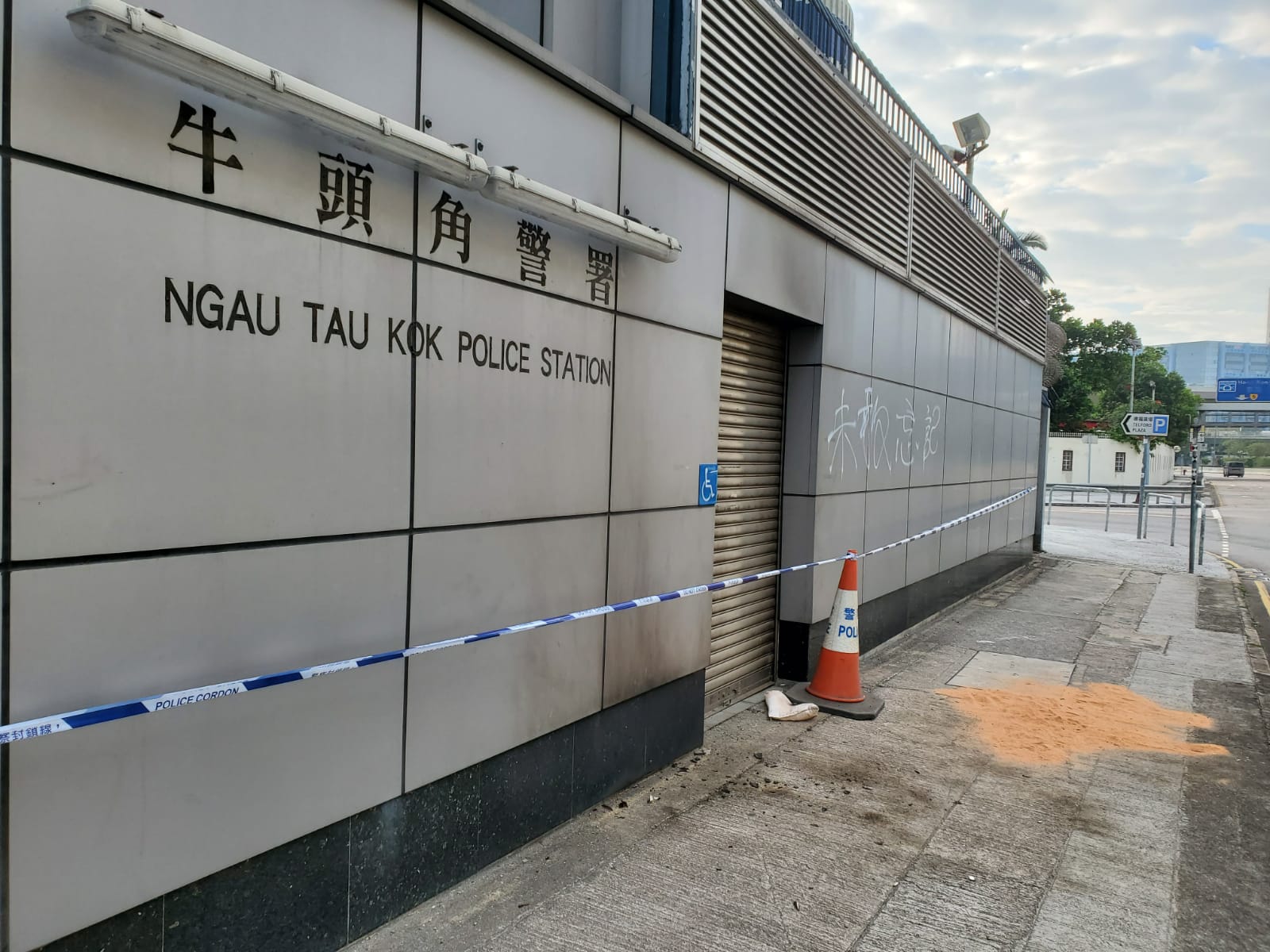报道称,牛头角警署大门及外墙被熏黑,现场地上留有两个疑似盛载煤油的铁罐、4支手提式石油气,以及玻璃瓶碎片。警署面向伟业街的外墙被喷上“未敢忘记”白色字迹,工作人员在场清理。