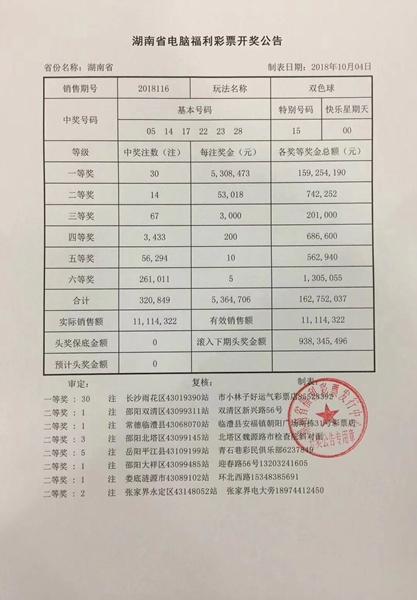值得一提的是,湖南彩民揽获30注一等奖,而经湖南省中心机房检索,这30注一等奖出自长沙市雨花区第43019390号小林子好运气彩票站,中奖票为一张30倍的单式自选票,奖金共计1.59亿元。