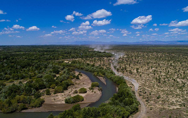 6月12日,赛车在新疆白杨河河畔的胡杨林间穿行。当日,2017中国(国际)环塔拉力赛暨中国越野系列赛新疆站第二赛段的比赛结束,该赛段从新疆塔城地区铁厂沟镇一路穿过戈壁、河流、峡谷,抵达和布克赛尔蒙古自治县铁布肯乌散乡,特殊赛段全长291.1公里。