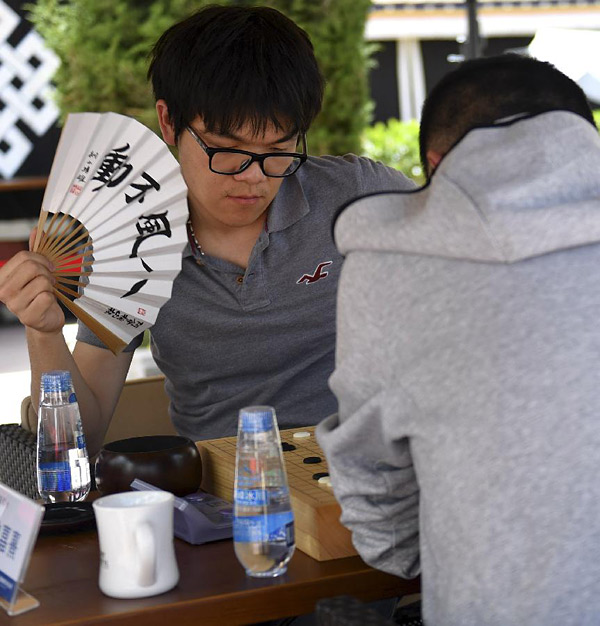 6月12日上午,一场别开生面的围棋比赛在雪域高原的布达拉宫脚下展开。对弈双方分别围棋国手柯洁与柁嘉熹。图为柯洁(左)与柁嘉熹在布达拉宫脚下对弈。(6月12日摄)