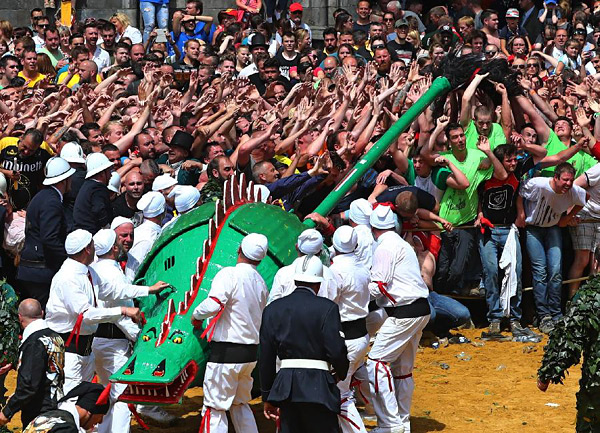 6月11日,在比利时南部小城蒙斯,人们在“屠龙节”的重头戏——屠龙仪式上争抢龙尾。根据传说,抢到龙尾的人一年都有好运气。当天,本年度“屠龙节”的两个最重要的环节——盛装巡游和屠龙仪式在这里上演,将节日的气氛推向高潮。蒙斯“屠龙节”已有600多年的历史。2005年,蒙斯这一传统节日被联合国教科文组织列为“人类口头和非物质文化遗产代表作”。