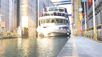 三峡升船机是船舶通过三峡大坝的快速通道。1月31日8时,兔年的第一艘客船“长江三峡5号”满载游客迎着朝阳进入船厢,满心豪情体验“小船坐电梯”的国之伟力。鄢玲祉 摄