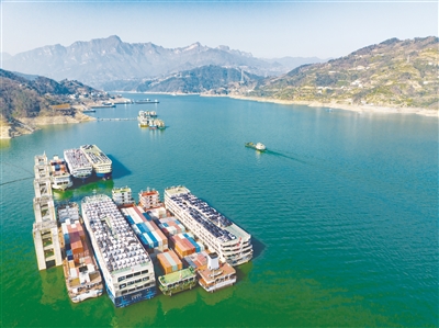 2月3日上午,从长江上游满载而来的商品车、集装箱船已完成安全检查,在三峡坝上沙湾锚地等待调度指令通过三峡船闸下行。林海 摄