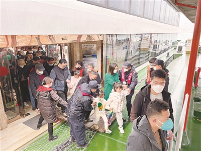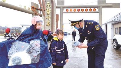 客渡船是定海东蟹峙岛居民出岛的唯一通道。2月6日一早,海事志愿者来到渡口向刚开学的孩子们与随同家长宣传水上遇险防护措施。刘继波 摄