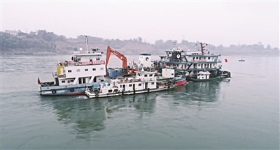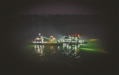 长江干线南京以上航道养护疏浚项目(合江门至丰都段)节后顺利复工复产,“长鹰5船”队正在水井湾滩段施工,为了保证该航道其他船舶航行安全,该船队白天让航(上图),夜间施工(下图)。周佳玲 殷壕 摄