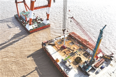 2月7日下午,一根直径5米、长40米的钢护筒成功打入浙江省舟山市册子岛海边的甬舟铁路西堠门大桥6号墩位置,为正式开钻作准备。 姚峰 张高峰 摄