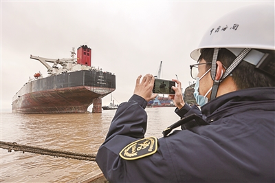 2月7日上午,巴拿马籍的30万吨级“伊莉莎(ELIZA II)”油轮正缓缓驶入浙江省舟山市鑫亚船厂1号船坞。 姚峰 苏彬 郭淼鑫 摄